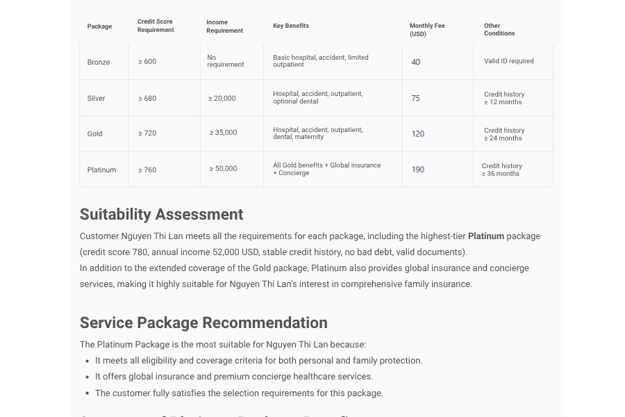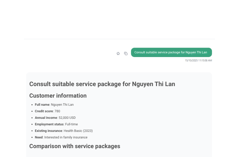 Advisors could simply enter client details such as age, income, and protection goals. The Agent then suggested suitable insurance packages and generated personalized consultation scripts.