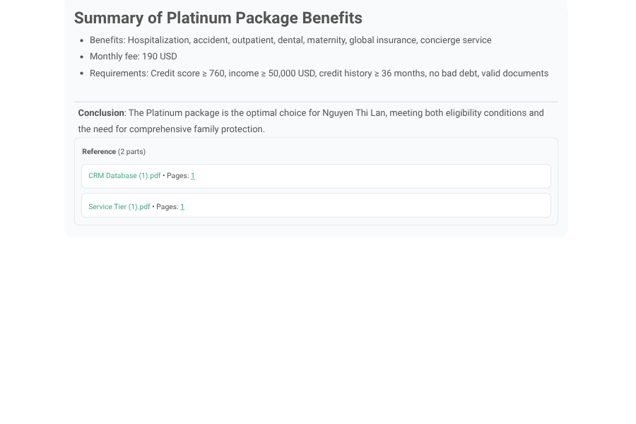 Insurance advisors needed to recall dozens of products with unique terms and eligibility rules. Manual lookups were time-consuming and error-prone, reducing both efficiency and conversion rates.