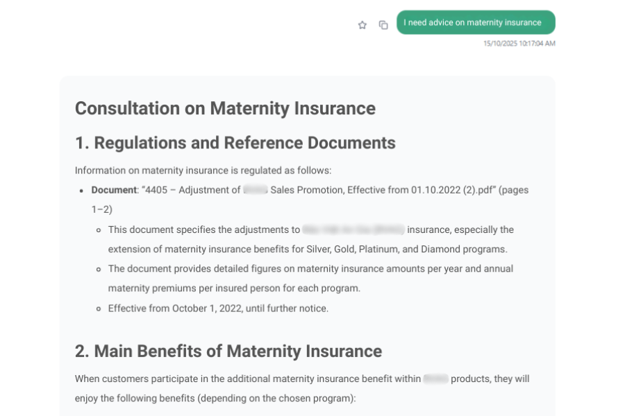 The Agent provided instant, verified answers to questions such as “I need advice on maternity insurance” or “Which maternity plan fits a 30-year-old client?”.