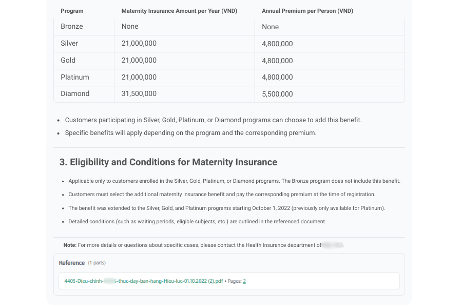 An insurance company sought to enhance the customer experience, especially for clients exploring maternity insurance packages. Previously, clients had to wait for advisor responses or manually navigate scattered documents.